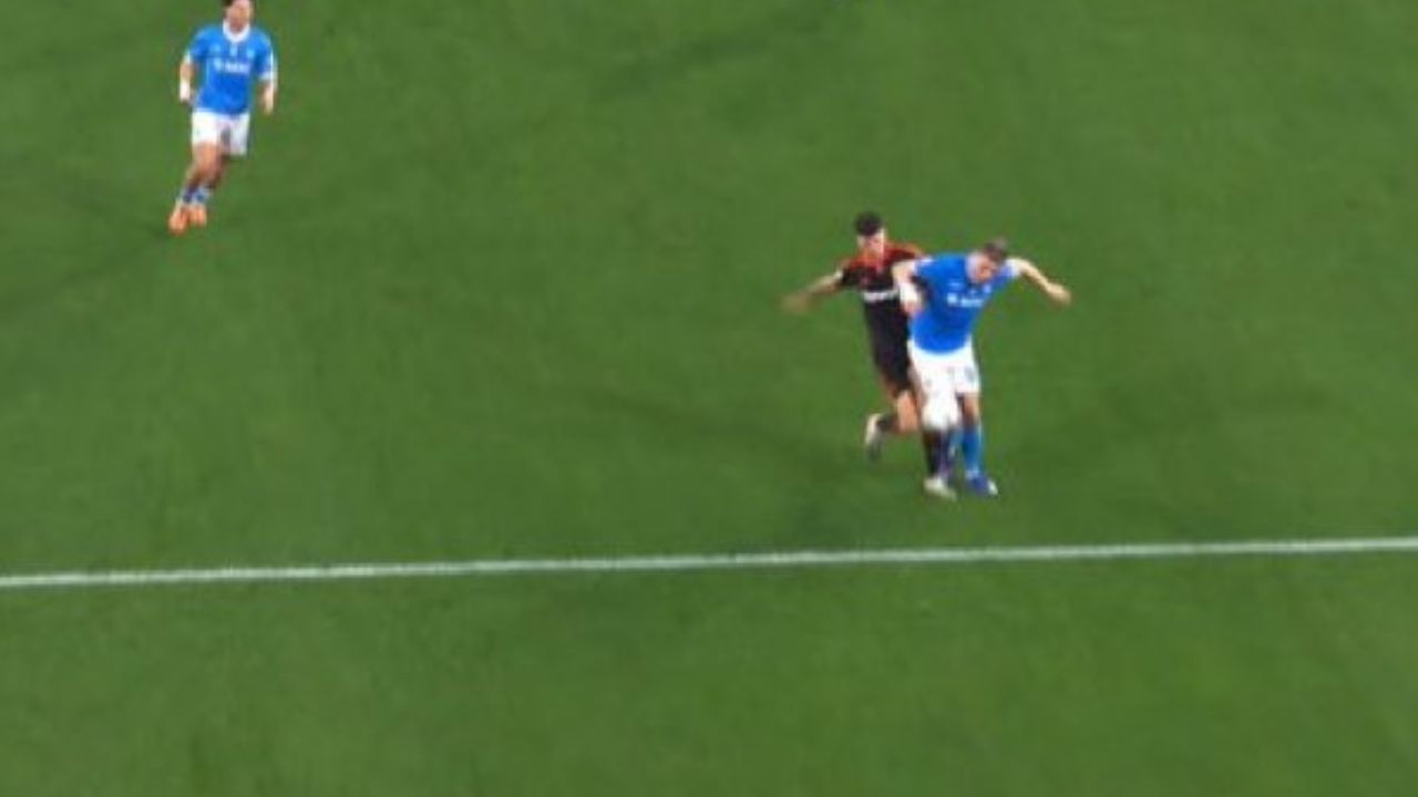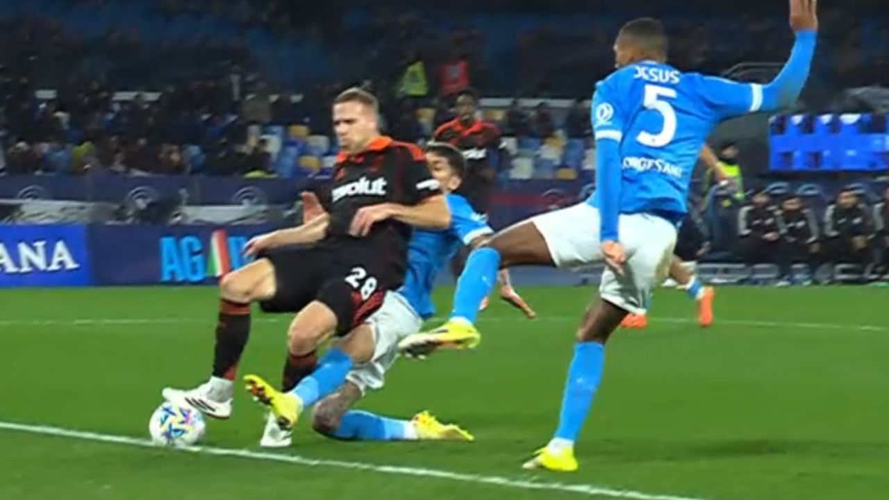Intervento scomposto di Mathias Olivera su Smolic nell’area di rigore degli azzurri: il laterale partenopeo manca l’impatto col pallone su un cross di Valle e colpisce il difensore dei lariani. Dopo il check con il VAR il direttore di gara assegna il penalty contro il Napoli. Dal dischetto si presenta Baturina che segna la rete del vantaggio.