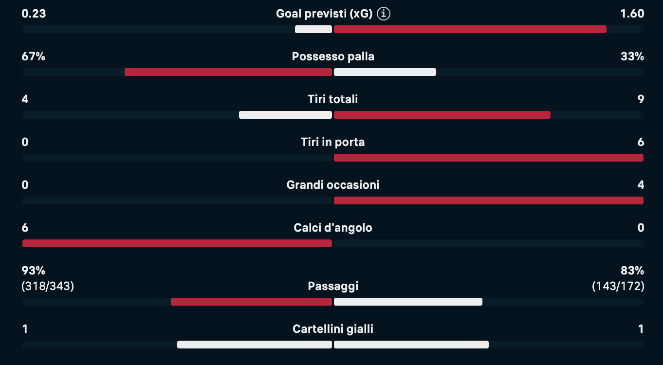 La SSC Napoli di Antonio Conte è padrona del campo con il 67% del possesso palla. I biancocelesti, dopo aver segnato il vantaggio, chiudono i primi quarantacinque minuti di gioco chiude con il 33% di possesso palla. Gli azzurri calciano in porta praticamente mai. La Lazio è nettamente più cinica e pericolosa: ben 9 i tiri, di cui 6 in porta.