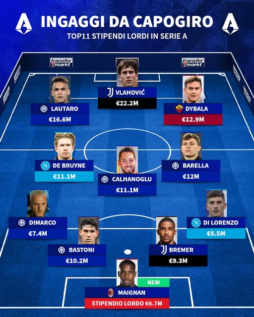 Ecco la top 11 degli stipendi lordi in Serie A secondo Transfermarkt.it, con una formazione stellare che unisce i nomi più pagati del campionato. In porta spicca il numero uno Milan, Maignan, con uno stipendio di 6,7 milioni lordi. La difesa vede Bastoni (10,2 milioni) e Bremer (9,3 milioni della Juventus), affiancati da Di Marco (Inter) e Di Lorenzo, rappresentante del Napoli con 5,5 milioni lordi.