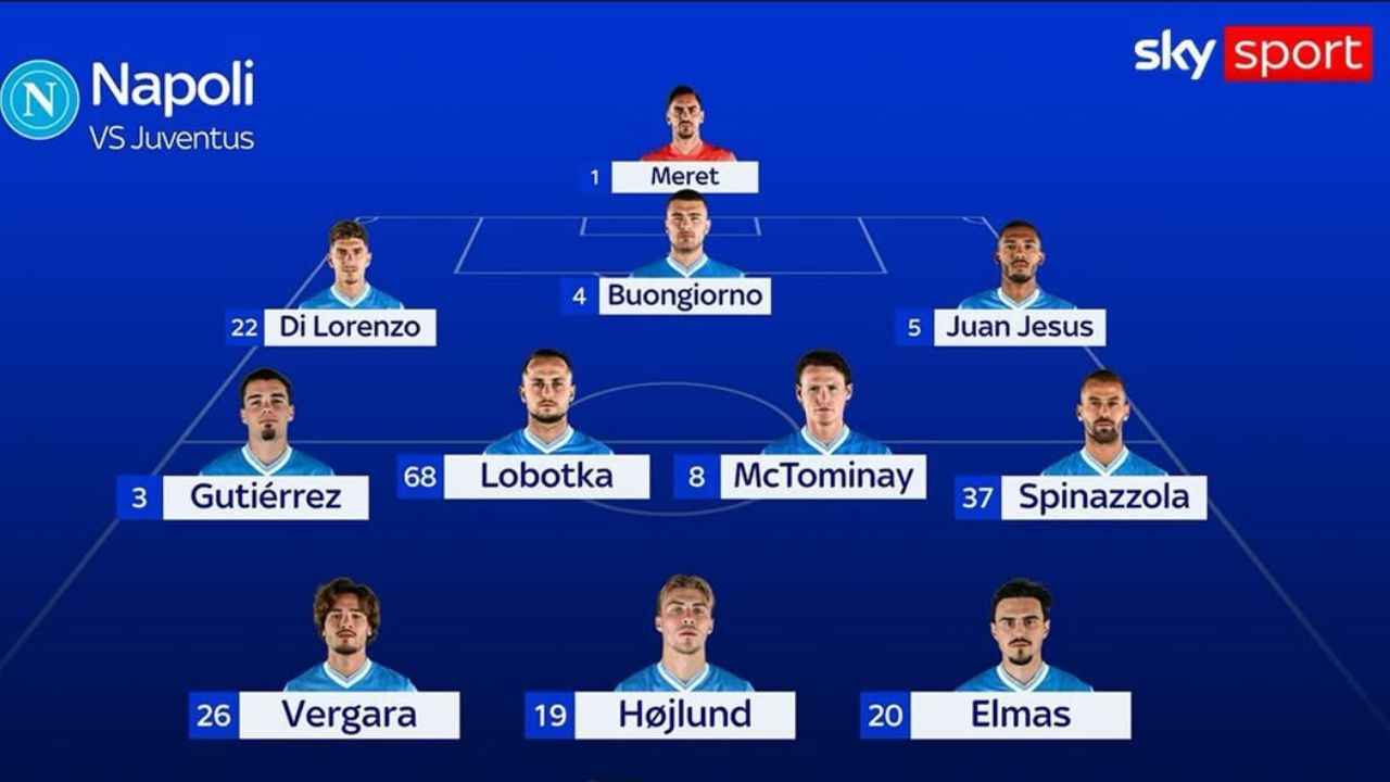 Sugli esterni agiranno Gutiérrez a destra e Spinazzola a sinistra. A centrocampo Lobotka e McTominay guideranno la manovra, mentre alle spalle di Højlund sono confermati Vergara ed Elmas. Dalla panchina sia Lukaku sia il nuovo acquisto Giovane, arrivato dal Verona.