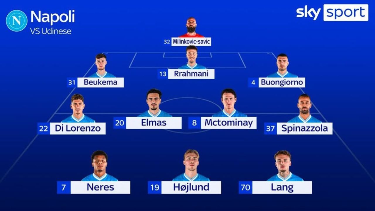 A centrocampo confermata la coppia Elmas-McTominay, mentre sugli esterni agiranno Di Lorenzo e Spinazzola. Davanti nessun dubbio: Neres e Lang larghi a supporto di Hojlund, riferimento centrale dell’attacco azzurro.