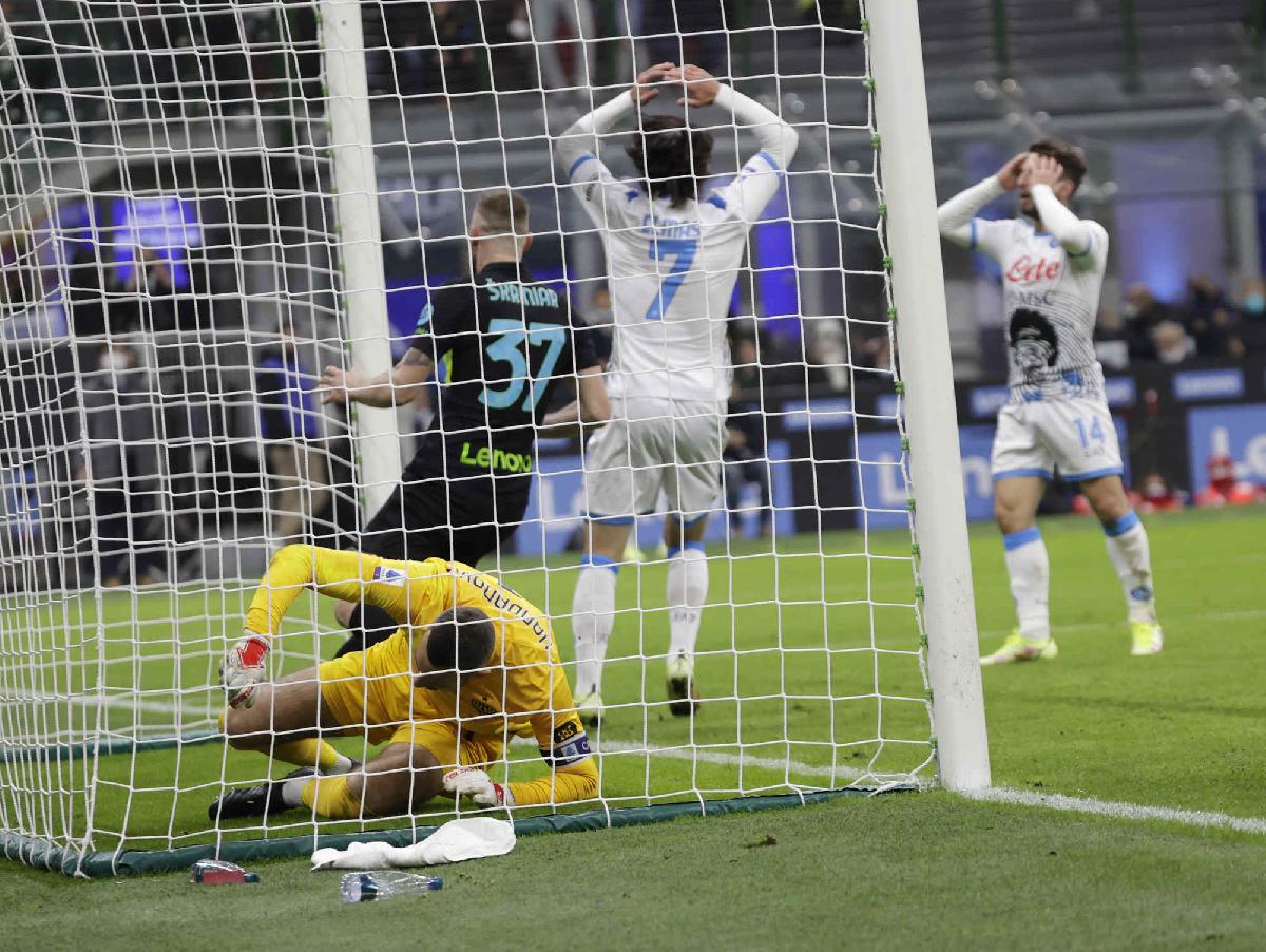 "Un colpo di testa a botta sicura di Mario Rui salvato da Handanovic sulla linea al 92esimo scolpisce questo Inter-Napoli terminato 3-2. Parlare di rammarico è un eufemismo per gli azzurri. Il Napoli passa per primo con un gran destro di Zielinski. Poi la rimonta della Beneamata che dopo un'ora si porta 3-1. Ma dopo è solo Napoli. Uno strepitoso destro di Mertens che si infila all'incrocio fissa il 3-2. E nei minuti di recupero succede di tutto. Mario Rui si tuffa sul secondo palo e Handanovic con una mano salva e con un'altra prega. Poi Mertens al 96 colpisce al volo da 3 metri e alza troppo la mira. Vince l'Inter ma solo per il risultato. Il Napoli esce da San Siro con la criniera alta dei leoni indomiti"