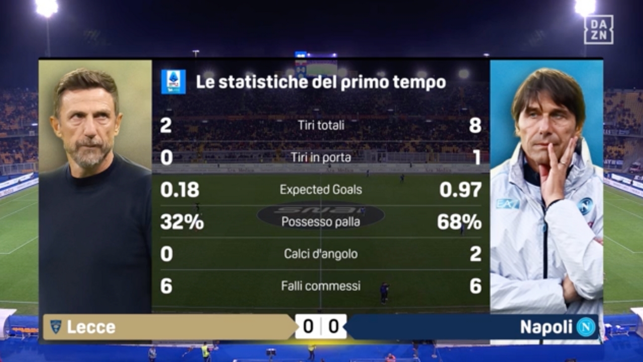 Ultime notizie Serie A - Lecce-Napoli finisce 0-0 dopo i primi 45'. Ecco le statistiche del primo tempo: