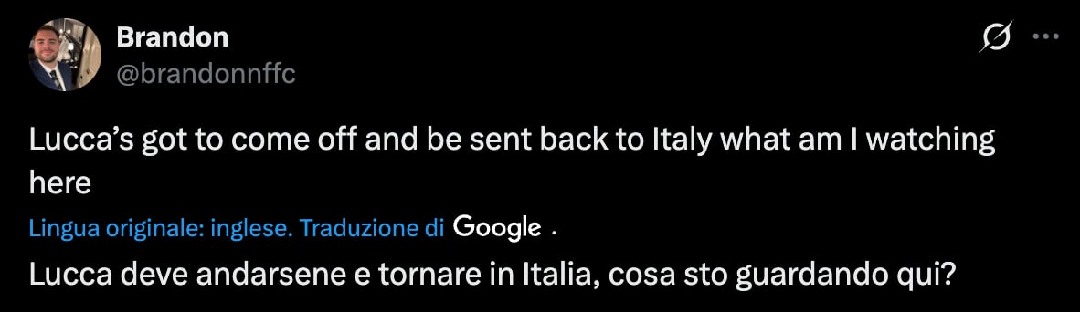 Dopo il primo tempo fermo sullo 0-0, il giocatore ex Udinese è stato bersagliato dai tifosi del Nottingham Forest che su X stanno commentando la prestazione del giocatore. "Lucca deve andarsene e tornare in Italia, cosa sto guardando qui?": scrive il tifoso Brandon. "Il nuovo attaccante è pessimo" .