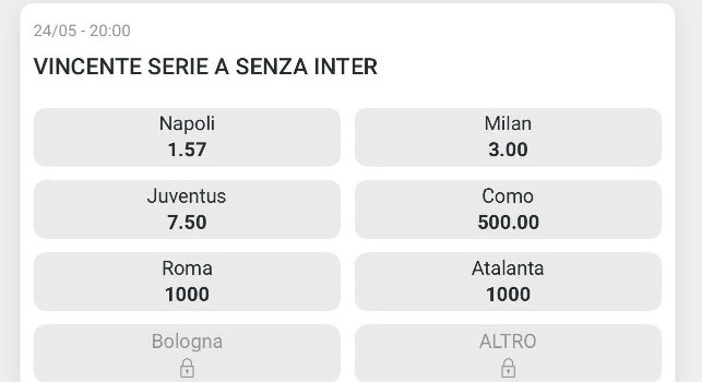 Molti tifosi del Napoli e non solo hanno pensato a un possibile collegamento dopo le ultime indescrizioni sulla possibile clamorosa indagine VAR del designatore Rocchi, ma andando in fondo la realtà è un’altra. Non è la prima volta, infatti, che accade: è nota abitudine di molti bookmakers e anche nell’anno del terzo scudetto del Napoli è accaduta una situazione simile. Le varie agenzia, nell’occasione, anche inserirono tra i vari palinsesti questa opzione. In realtà si tratta della seconda classificata: vincerà la scommessa chi punterà bene su quella che, senza l'Inter ormai vincente scontata, sarebbe stata appunto la squadra campione.
