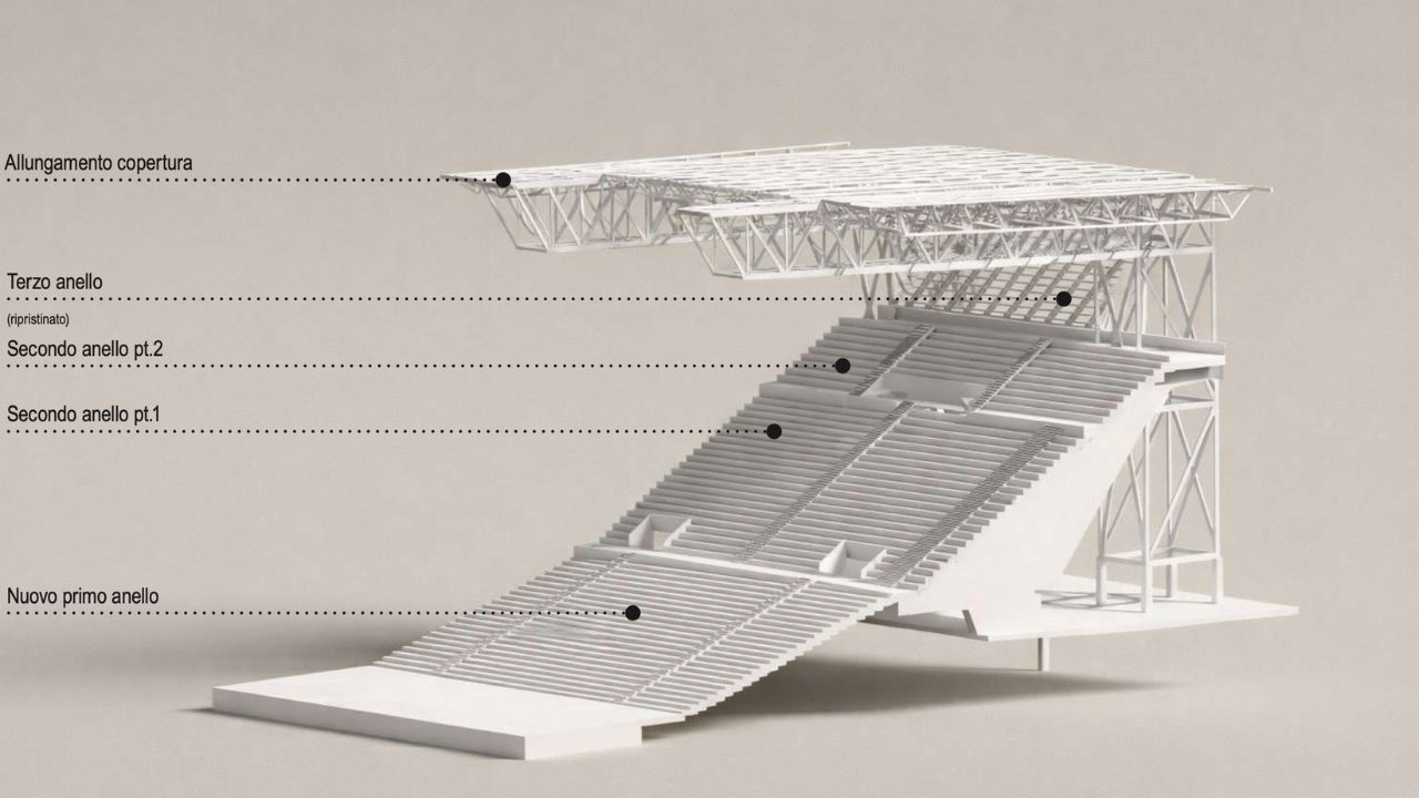 «Abbiamo presentato lo stato di avanzamento del progetto per il nuovo Maradona, in particolare il progetto di tutta la sistemazione interna con il nuovo primo anello a ridosso del campo. Il progetto è completamente realizzato in modalità Bim (Building information modeling, ovvero con utilizzo di una metodologia basata sulla creazione di un modello digitale 3D integrato con dati tecnici, prestazionali, strutturali e impiantistici, ndr). Nelle immagini diffuse si evidenzia l'attuale posizione non simmetrica del campo e quella nuova, centrata, con gli spalti ravvicinati: sezioni strutturali e tutti i posti rispettano i requisiti Uefa sulla visibilità».