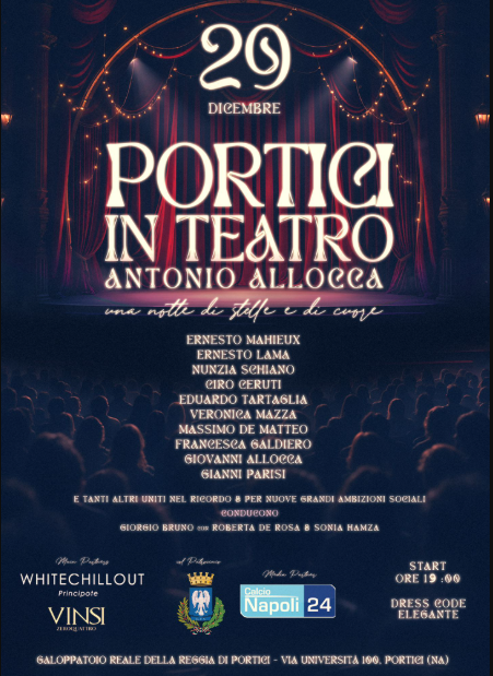 PORTICI – La notte del 29 Dicembre non sarà una notte qualunque. Sarà un tripudio di emozioni, un inno alla vita e all'arte, un vero e proprio tourbillon di magia che scenderà sulla città. La suggestiva e storica cornice del Galoppatoio Reale della Reggia di Portici è pronta ad aprire i suoi cancelli per l'evento dell'anno: "Portici in Teatro - Premio Antonio Allocca". È tutto pronto per la Charity Night, uno spin-off di gala nato per onorare la memoria del grandissimo attore porticese Antonio Allocca, ma che guarda al futuro con occhi pieni di speranza. Il teatro qui non è solo palcoscenico, ma diventa strumento potente di libera espressione e, soprattutto, di inclusione sociale.