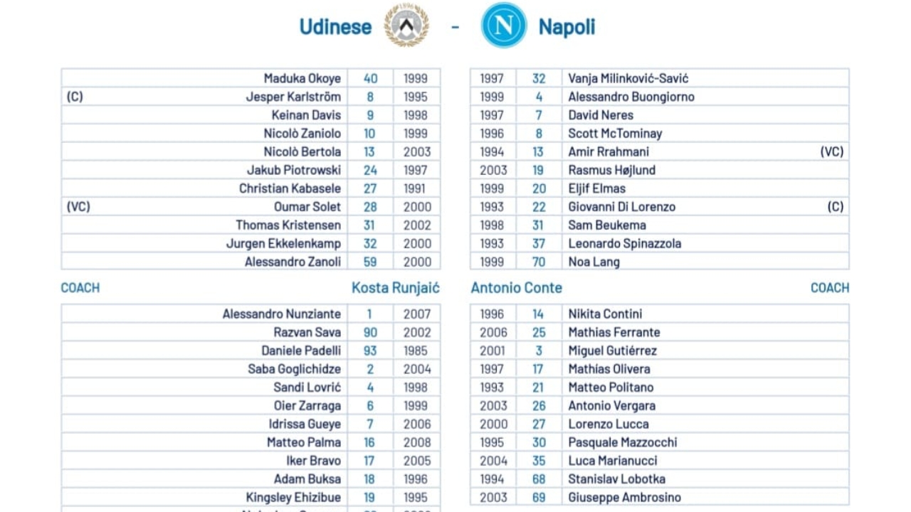 - UDINESE (3-5-2): Okoye; Kristensen, Kabasele, Solet; Zanoli, Piotrowski, Karlstrom, Ekkelenkamp, Bertola; Zaniolo, Davis.