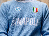 Ispirato a una delle maglie più iconiche della storia del club, questo retro jumper riprende elementi grafici che hanno segnato l’identità visiva del Napoli. Il fondo bianco è attraversato da due bande diagonali azzurre che definiscono il disegno del capo, mentre il logo SSC Napoli sul petto rafforza il legame con la tradizione.