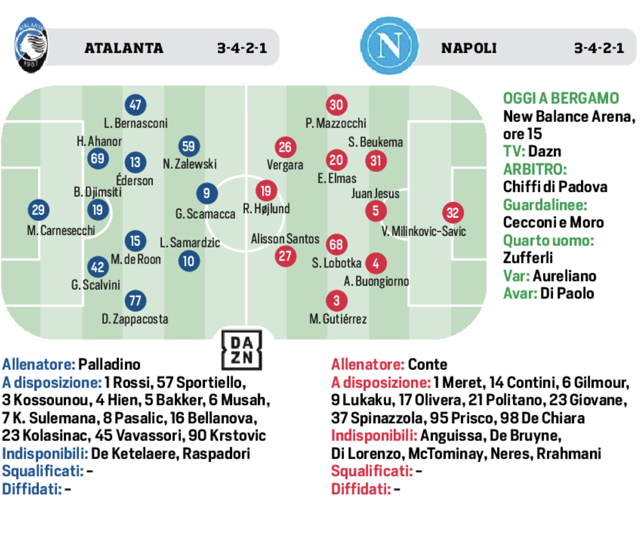 Stando a quanto si legge sulle pagine del Corriere dello Sport, in porta giocherà il serbo Vanja Milinkovic Savic. In difesa, complice l’infortunio di Amir Rrahmani, tornerà titolare Juan Jesus che farà il centrale con Alessandro Buongiorno e Sam Beukema braccetti difensivi. Accanto a Stanislav Lobotka c’è Elif Elmas con Miguel Gutierrez (preferito a Spinazzola che non sta benissimo) che torna nel suo ruolo di esterno mancino mentre a destra c’è Pasquale Mazzocchi e non Matteo Politano. Sulla trequarti spazio a Antonio Vergara ed Alisson Santos che fa il suo debutto dal primo minuto (era sempre subentrato dalla panchina nelle ultime gare). Terminale offensivo è il danese Rasmus Hojlund che è anche l’ex di giornata avendo vestito la maglia dell’Atalanta qualche anno fa.