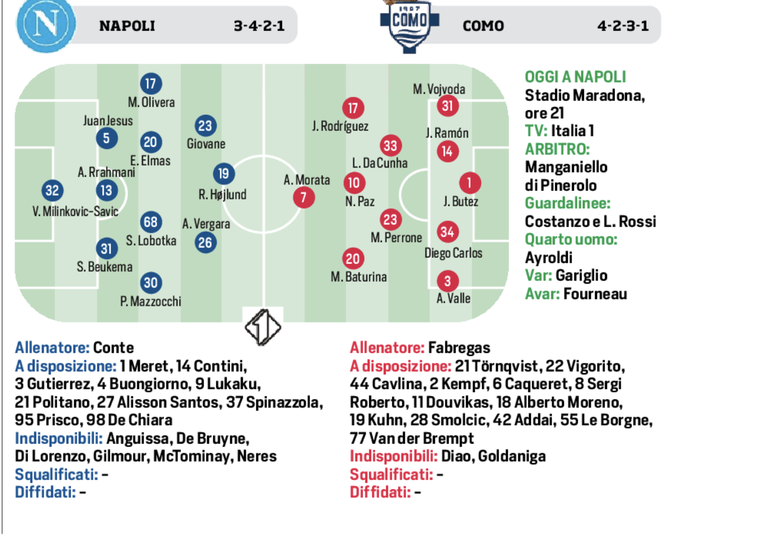"Così in mediana accanto a Lobotka si abbasserà Elmas, il jolly di Conte che gioca ovunque serva. Sarà questa una delle principali novità di giornata, ma non sarà l’unica. Dalla porta all’attacco, Conte ridisegna la squadra anche per gestire le rotazioni e poi pensando proprio ai giallorossi che arriveranno domenica sempre al Maradona alle 20.45. In porta riecco Milinkovic-Savic, tornato in panchina a Genova e ora pronto a ritrovare una maglia da titolare.