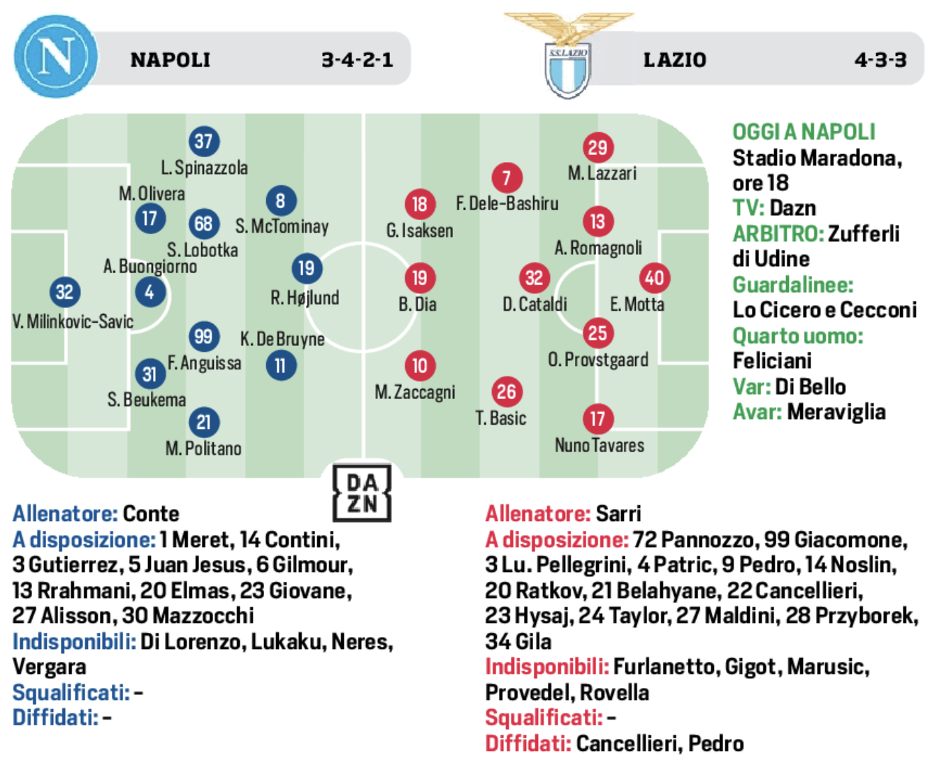Sarri si affida al 4-3-3 con Motta tra i pali; difesa con Lazzari, romagnoli, Provstgaard e Tavares. A centrocampo Delle Bashiru, Cataldi e Basic. Tridente offensivo con Isaksen, Dia e Zaccagni. Lunga la lista degli indisponibili in casa Lazio. Al Maradona amicheranno, Provedel, Furlanetto, Giogo, Marusic, Rovella.