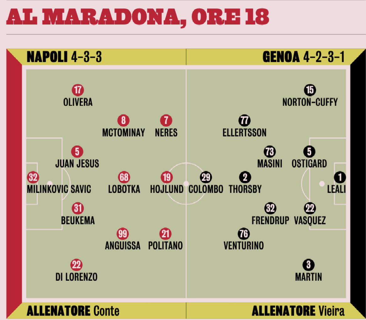 In porta c'è la riconferma di Vanja Milinkovic Savic. In difesa si rivede Di Lorenzo - il capitano era squalificato in Champions League - poi spazio a Beukema, Juan Jesus e Olivera a sinistra. Resta fuori Spinazzola: l'ex Roma è stato tra i migliori in campo mercoledì con lo Sporting. A centrocampo Lobotka, Anguissa e McTominay. A restare fuori è Kevin De Bruyne che si accomoderà in panchina dopo la buona prestazione con lo Sporting. In attacco la novità è Neres con Hojlund e Politano. Sarà un Napoli con il 4-3-3.