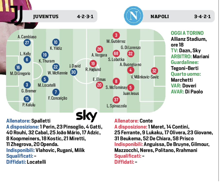 Nella lunga lista degli infortunati - stando a quanto riporta il Corriere dello Sport - non figura Milinkovic Savic che dunque recupera dal risentimento muscolare e va regolarmente in campo. Poi difesa a tre con Di Lorenzo, Buongiorno e Juan Jesus. A centrocampo Gutierrez a destra, Spinazzola a sinistra con Lobotka e McTominay centrali. Vergara ed Elmas sulla trequarti alle spalle di Hojlund. Panchina iniziale per il nuovo arrivo Giovane.