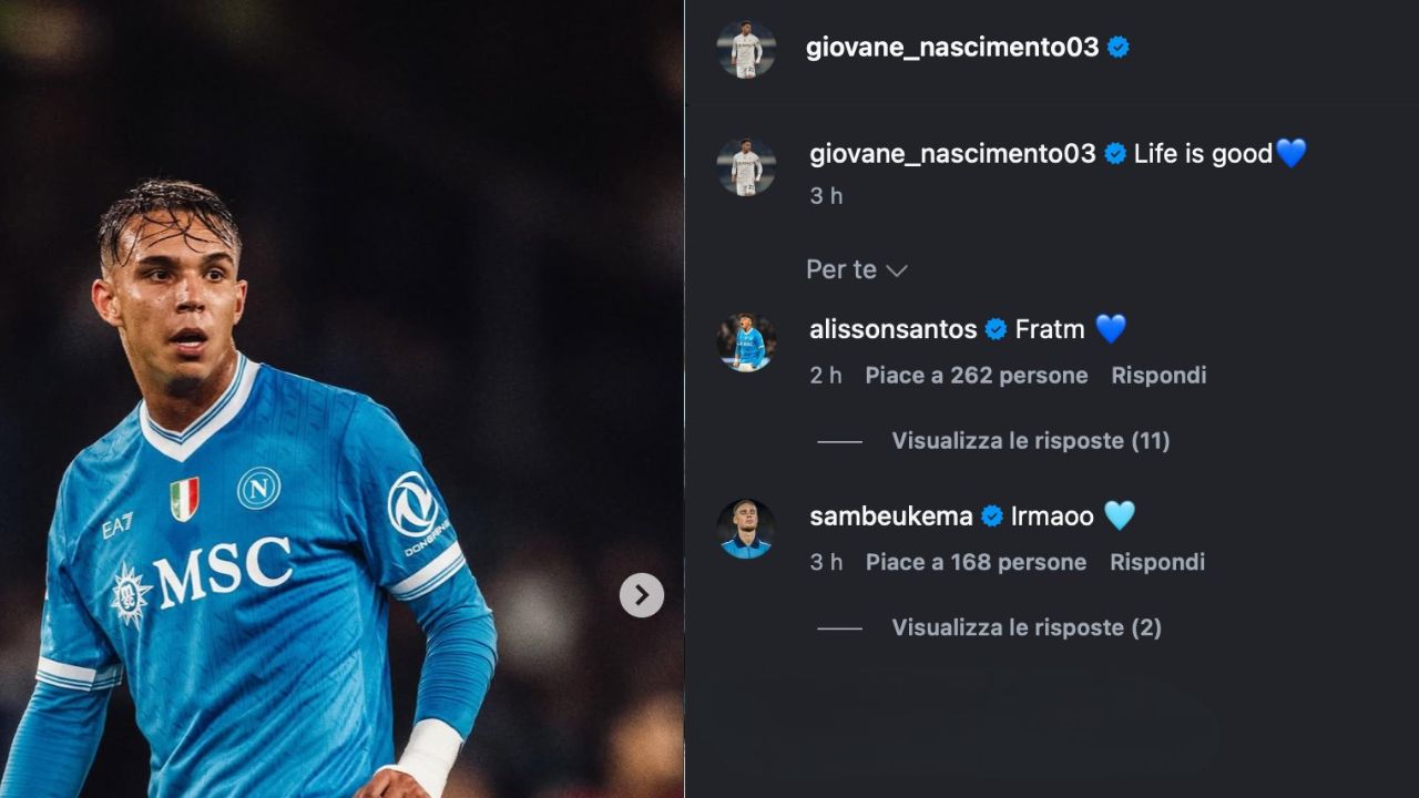 Tra i commenti, spunta anche il connazionale Alisson Santos che sembra essersi adattato alla grande in terra partenopea. “Fratm”, scrive infatti l’esterno che sarà riscattato dallo Sporting e che prende confidenza anche con la lingua intanto. “Irmao”, scrive invece in portoghese Sam Beukema.